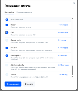 Ключ API должен иметь следующие роли: Cancellation Company Want discount Rating Review Question Posting FBO Chat Returns Report FBP Product Posting FBS